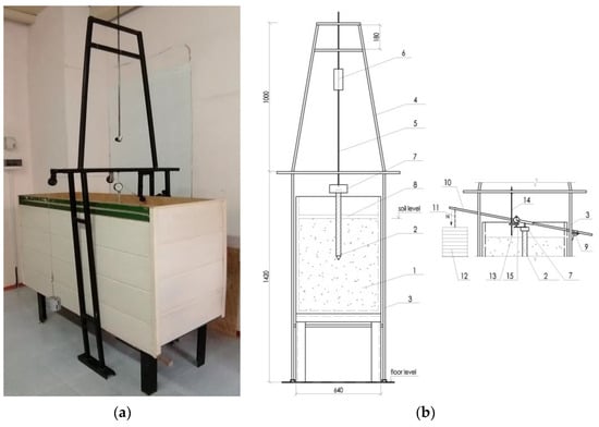 General view (a) and scheme (b) of the soil tray and attachments for driving and testing pile models. 1—Soil tray; 2—pile model; 3—inverted U-shaped lower frame; 4—upper frame with inclined racks; 5—guide rod; 6—hammer; 7—headrest; 8—removable guide beam; 9—hinged part of the lever system; 10—beam-lever; 11—cable; 12—container for cargo; 13—indicator; 14—rod for attaching the indicator; 15—cantilever plate.
