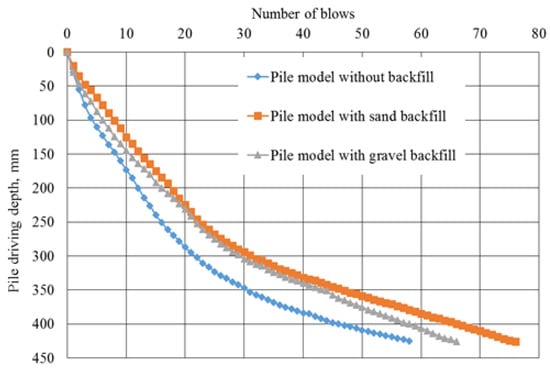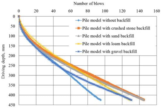 - Depending on the type of rigid material used as backfill, at the same depth of immersion, the experimental pile models (with backfill) exhibited a 1.36–1.54-times-higher energy intensity during driving compared to the control pile model (without backfill).