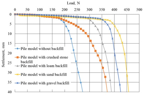 (3) The type of backfill material affected the resistance of the piles to axial static loads. The greatest resistance was typical for piles driven with added sand, and the lowest with added crushed stone. Specifically, the load-bearing capacity of piles filled with sand surpassed that of piles filled with crushed stone and loam by factors of 1.23 and 1.18, respectively. Similarly, the bearing capacities of piles filled with gravel were 1.15 and 1.10 times higher, respectively. Based on the load-bearing capacity of the piles, it was preferable to use sand and gravel as backfill material.