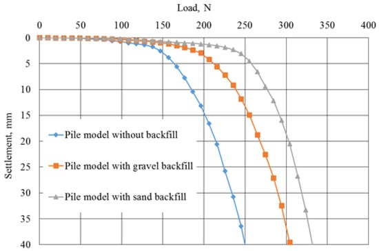 It was evident from the test results that the load-bearing capacity of the pile models filled with gravel and sand exceeded that of pile models lacking any backfill material (as outlined in Table 8). Notably, the pile model driven with sand exhibited the highest load-bearing capacity, surpassing the pile model with gravel backfilling by 7.06%.