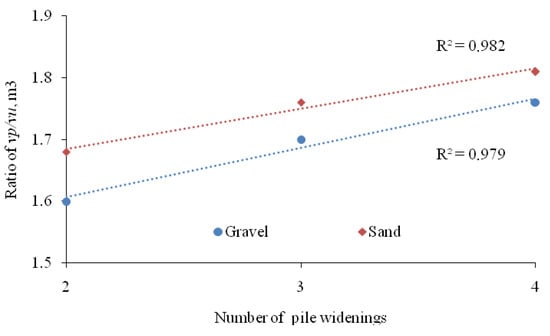 A comparison of the test results of driving pile models with 2–4 widenings buried with sand and gravel showed the influence between the number of widening in pile models and the amount of backfilling material. An increase in the number of widening led to an increase in the bulk material entrained by their widening into the soil (Table 9).