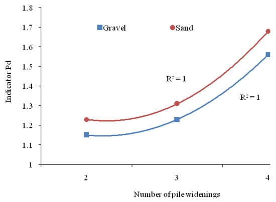 The load-bearing capacity of the pile models increased with their number of widenings (Table 13). This regularity is well described by a polynomial function of the second degree (5) (Figure 14).
