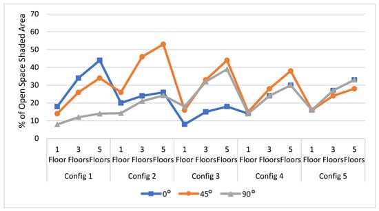 Configurations 4 and 5 included a central open space related to the buildings in a symmetrical pattern. Thus, the NS and EW orientations exhibited the same shading performance for each configuration. The percentages of open space shaded areas in both orientations were 30% and 33% for configurations 4 and 5, respectively. Similar values were obtained at a site rotation angle of 45°, as can be observed in Table 2.