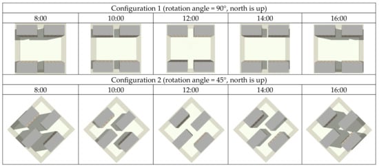 Shading patterns at different times during a typical summer day in Configuration 1 (with a rotation angle of 90°) and Configuration 2 (with a rotation angle of 45°), which offered the lowest and highest summer shading amount in the examined public open spaces, respectively.