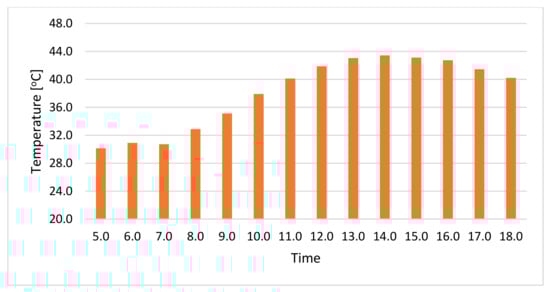 Figure 4 shows the hourly average external air temperature during summer daytime in Dhahran City. It shows that the peak temperature approaches 44 °C, while the average temperature is about 38 °C. Higher temperature values were observed in the afternoon hours compared to the morning hours. Figure 5 shows the daily average open space external surface temperatures for the different cases examined, which ranged between 46.4 °C and 50.48 °C. To find out the impact of shading on open space surface temperature, hourly temperature data were calculated during the daytime and averaged for the first and middle days of June, July, and August to represent summer. The general trend of the graph shows a strong negative correlation with the open space shading measurements, as presented in Figure 2. The correlation factors between open space surface temperature and shaded area were −0.8, −0.9, and −0.9 at site rotation angles of 0°, 45°, and 90°, respectively. This demonstrates the direct impact of urban shading on reducing the open space surface temperature. In addition, the surface temperature decreased as building density increased in all cases. However, the highest reduction was observed in Configuration 2 at the 45° orientation of the site, where a temperature reduction of 3.4 °C was observed when building height was increased from one to five floors. This case also offered the highest shading percentage, as described in Section 4.1. In some other cases, the observed variation in the open space surface temperature was limited. This is because of the relatively high solar altitude in Saudi Arabia, which reduces the amount of urban shade in the examined cases. This limits the shading impact on the examined variables such as open space surface temperature.
