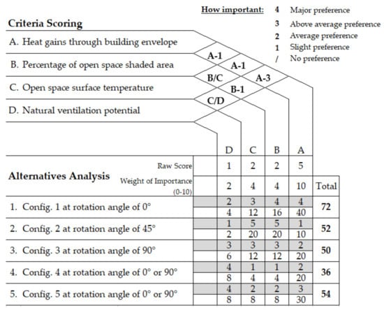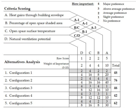 A weighted analysis using a multi-objective evaluation matrix was developed to compare the shortlisted design alternatives, as shown in Figure 6. In comparing the two criteria, the preference for one over the other was scored as follows: 1 = slight preference, 2 = average preference, 3 = above-average preference, and 4 = major preference. In Figure 6, the four criteria are listed as A–D. For example, in the triangular portion of the matrix, the heat gains through the building envelope (A) were compared to the percentage of the open space shaded area (B). Criterion A had a “slight preference” over criterion B, A-1 was placed in a diamond-shaped cell linking the two criteria. Similarly, criteria C and D were compared and because they were equally preferred (no preference), C/D was recorded. In the lower part of the matrix, raw scores for the criteria were calculated based on the number of times the criteria appeared in the upper part of the matrix. For example, A was given a raw score of 5, whereas D received a score of 1. These raw scores were then converted into weights by normalization using Equation (1):