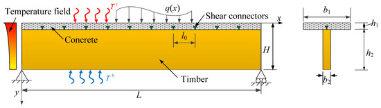 As one sustainable bio-based building material, the increased use of 1% timber to replace building materials (i.e., steel, brick, concrete, etc.) in construction can reduce greenhouse gas emissions by about 1.2% accordingly. With advantages such as environmental friendliness, lightweight, sound insulation, ease of processing, and visual appeal, timber–concrete composite (TCC) beams have wide application in the field of construction engineering [1,2,3]. As a structural member, the TCC beam combines the advantages of both timber and concrete. There are two key points for the design and application of TCC beams. The first is that the biological and morphological characteristics of timber, including cell direction, cell wall feature, and growth ring, lead to significantly different properties along the longitudinal, radial, and tangential directions [4]. The other is that the interfacial slip between timber and concrete occurs more or less because of the limited stiffness shear connector [5]. In addition, the TCC beam is often subjected to both a mechanical load and a temperature environment; meanwhile, the properties of heat conductivity and thermal expansion are different between timber and concrete. Such a problem is important for the design and application of TCC beams, and it deserves to be investigated in depth.