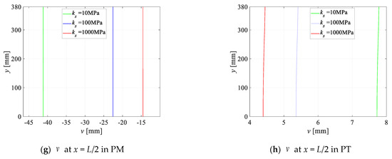 Figure 3 demonstrates the variations in the stresses and displacements of the TCC beam with respect to under pure mechanical (PM), pure thermal (PT), and thermo-mechanical (MT) conditions, respectively. From Figure 3, it is evident that under the PM condition, and when 10 < < 105 MPa, there is a sharp decline for , u, and , whereas the stresses and displacements remain constant in the rest ranges. For the ranges of < 10 MPa and > 105 MPa, it can be referred to as no connection and perfect connection. Conversely, under PT condition, when 10 < < 105 MPa, the variations in the stresses and displacements are opposite to those observed under the PM condition. As increases, the corresponding manufacturing cost also increases, and Figure 3a–d indicates that the optimum cost effectiveness is achieved when the is around 105 MPa. At the interface, tends to zero when 10−2 < < 10 MPa. And, with the increasing , the absolute value of under the PM and PT conditions both increase, but the stress directions are opposite. Under the combined action of the PM and PT conditions, the behavior of , u, and is consistent with the results of the mechanical-thermal coupling, adhering to the superposition principle.