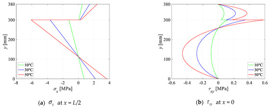 Since and are determined in Section 2.1, there are eight undetermined coefficients for each series item, i.e., and eight conditions, including six interfacial conditions and two surficial conditions, and thus, for each component of the TCC beam can be solved uniquely. In the end, the solution of stresses and displacements at any position in the TCC beam under a thermo-mechanical load is obtained.