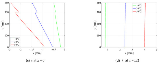 Figure 5 shows the y-direction distribution of stresses and displacements of the TCC beam under the PT condition with = 1000 MPa for different surficial temperature difference, i.e., = 0 °C, = 10, 30, 50 °C, respectively. It can be found that , u, and all increase with rising the surficial temperature difference, primarily due to the difference of thermal expansion between the concrete and timber parts. The maximum values of and occur at the interface between timber and concrete, attributable to the differences in the characteristics of the two materials. As increases, the temperature field in concrete increases more significantly than that in timber. Thus, u in concrete is larger than that in timber, but the stresses in concrete are less than those in timber.