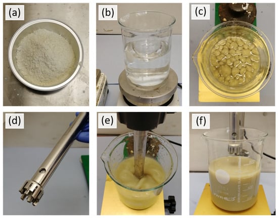 For the preparation of the MMT dispersion, pristine MMT powder was weighed and then added in portions into a beaker filled with de-ionized water under constant stirring at 200 rpm. Stirring was performed with a Heidolph MR 3001 magnetic stirrer from Heidolph Instruments GmbH & Co.KG (Schwabach, Germany) with the appropriate magnetic stirring bar. After all of the solids had been added, the speed was increased to approximately 600 rpm, and mixing was continued for a further 5 min. In most cases, a homogeneous dispersion could not be achieved during this mixing process. Therefore, an ULTRA-TURRAX®-T25 basic mixer from IKA®-Werke (Breisgau, Germany) was used for 15 min to break up coarse agglomerates: at first for approx. 3 min on speed 1 (6.500 rpm), and then the rest of the time at speed 2 (9.500 rpm). After disaggregation of the large agglomerates, the full beaker was treated in an ultrasonic bath at 25 kHz for 4 h. Due to the energy input of the ultrasonic treatment, the water in the ultrasonic bath that surrounded the filled beaker was heated up to approximately 80 °C. After 4 h, the filled beaker was removed from the ultrasonic bath and left to rest for use the next day. The complete process for preparing an 800 mL MMT nanoclay dispersion is shown in Figure 2.