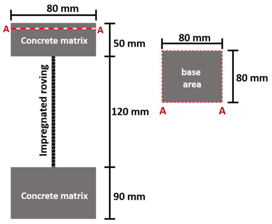 To characterize the bond between different impregnated carbon rovings and the concrete matrix, one-sided pull-out tests were conducted using a custom-designed setup and an INSTRON 8501 universal testing machine (Norwood, MA, USA). The yarn pull-out was carried out at a speed of 1 mm/min under normal climate condition. The force was recorded with a 20 kN load cell. For each variation of impregnation, 12-15 test specimens were prepared. This method and specimen preparation are well known and have been established in recent years in other works [27,28,63].
