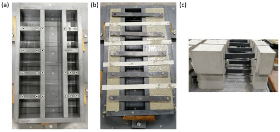 The fresh concrete described in Section 2.1.2. was used to prepare the YPO specimens, specifically their upper and lower cuboids, respectively. The exact dimensions are shown in Figure 4. First, the impregnated carbon rovings were fixed in the formwork (Figure 5a). After fresh concrete was produced, it was poured into the provided cavities (Figure 5b). After one day of curing, the YPO specimens reached green strength and could be demolded (Figure 5c).