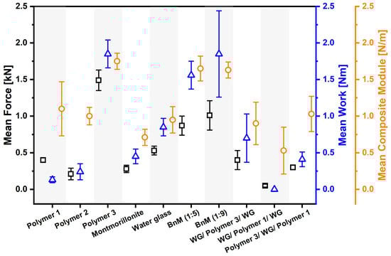 Overview of the polymer content determined by TGA and mean values of maximal pull-out force Fmax, pull-out work calculated for a displacement from 0 to 2.5 mm, and the bond modulus for YPO.