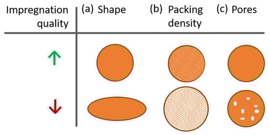 Schematic overview of the factors that describe the quality of roving impregnation depending on (a) the shape, (b) the packing density, and (c) occurring pores [64,65].