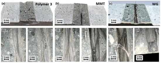 Cross-section of split post yarn pull-out specimens of selected rovings, which were impregnated with (a) Polymer 3, (b) montmorillonite (MMT), and (c) water-glass (WG), with selected 5× magnifications (i) and (ii) from both split sides.