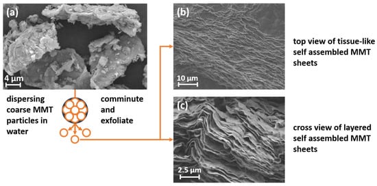 SEM images of (a) pristine montmorillonite (MMT) particles, which were dispersed in water and dried afterward, leading to the observed (b) surface- and (c) cross-view of exfoliated, self-assembled MMT layers.