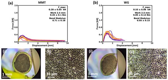 Force–displacement curves, where each curve of different color represents a tested specimen, of rovings impregnated only with (a) montmorillonite (MMT) and (b) water glass (WG), with additional selected light microscope images of the cross-section of the above-mentioned impregnated yarns at (i) 5× and (ii) 50× magnification.