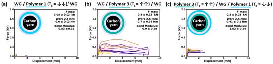 Force–displacement curves, where each curve of different color represents a tested specimen, of the layer-by-layer-like impregnated rovings with layers (colored and underlined) of: (a) water–glass (WG)/Polymer 1/water–glass (WG), (b) water–glass (WG)/Polymer 3/water–glass (WG), and (c) Polymer 3/water–glass (WG)/Polymer 1.