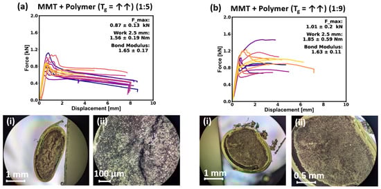 Force–displacement curves, where each curve of different color represents a tested specimen, of the brick-and-mortar-like impregnated rovings with (a) a high montmorillonite (MMT) content (MMT:polymer ratio = 1:5) and (b) a low MMT content (ratio = 1:9) compared with a mixture of Polymer 3, with additional selected light microscope images of the cross-section of the above-mentioned impregnated yarns at t (i) 5× and (ii) 50× magnification.