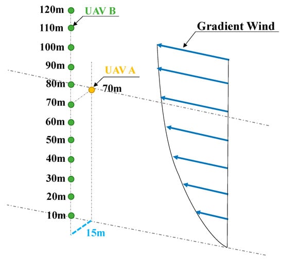- Utilizing a dual UAV measurement strategy, we conducted precise assessments of wind speed and turbulence intensity spanning a 120 m range above the site. After data analysis, our fitting result indicated an α value of 0.2878, which falls between the type-C and type-D terrains specified in the GB50009-2012 standard [27]. Importantly, this methodology offers significant advantages in terms of cost-effectiveness and operability, providing an efficient and economical means for outdoor wind field evaluations.