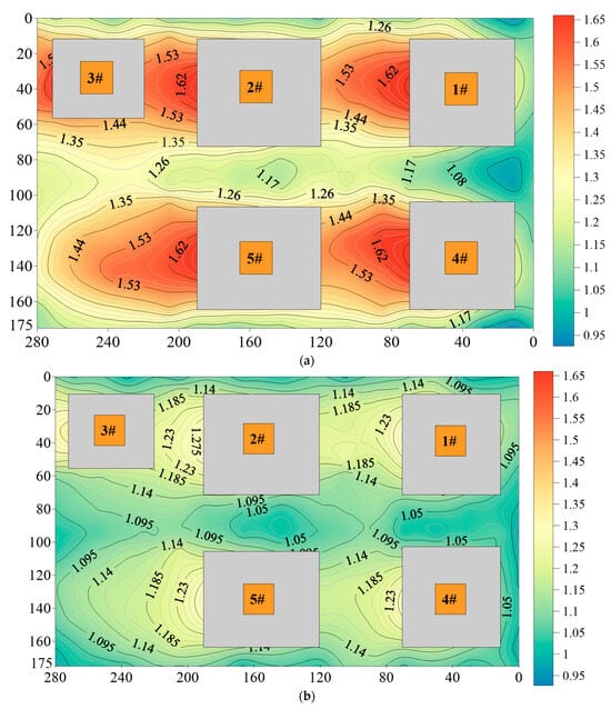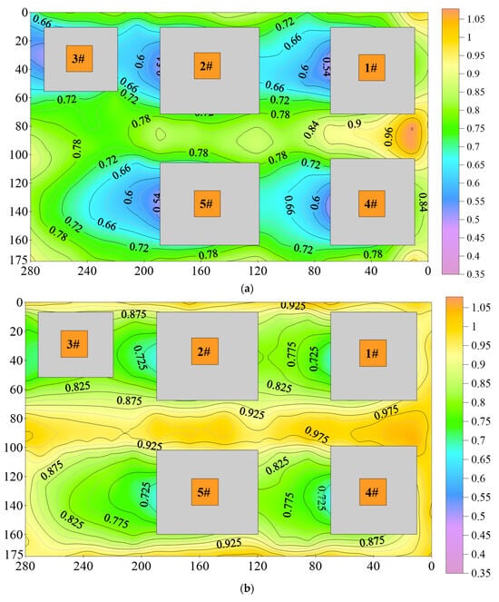 - Wind field information at two height planes in the building complex flow field was obtained. The results indicate that the closer buildings are to each other, the more pronounced the attenuation (enhancement) effect on wind speed (turbulence intensity) of tall structures. The influence of the wake flow extends outward, and the wind speed reduction (turbulence intensity enhancement) is more prominent in the plane below the building height range. The wake wind field of buildings is significantly affected by nearby structures, and the length of the wake is greater than 4.5 times the building height.