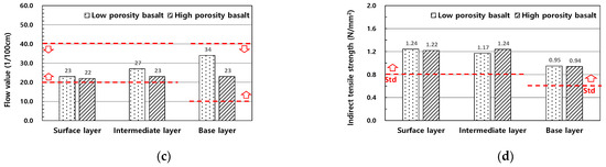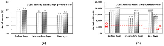 - The mix design of asphalt mixtures for the surface, intermediate, and base layers was performed using Jeju Island basalt aggregate. The optimum asphalt contents of the asphalt mixture using low-porosity basalt aggregate and high-porosity basalt aggregate were 5.7% and 5.9% for the surface layer, 5.3% and 5.4% for the intermediate layer, and 4.7% and 5.1% for the base layer, respectively, which were slightly higher than those of the typical asphalt mixture using granite aggregate.