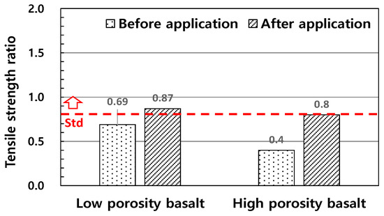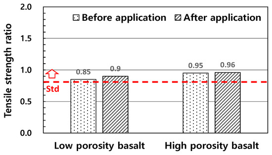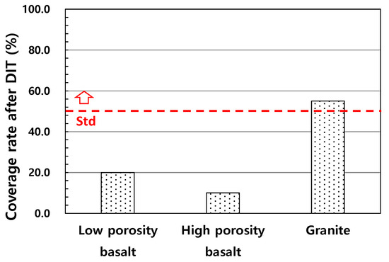- As a result of evaluating the stripping resistance of basalt aggregate through a coverage test after dynamic water immersion, it was found that the coverage rates of low-porosity basalt aggregate and high-porosity basalt aggregate were 20% and 10%, respectively, which fell far short of the quality standard of 50%. A tensile strength ratio test was performed to evaluate the moisture resistance performance of the mixture using basalt aggregate, and the tensile strength ratio of the asphalt mixture for the intermediate layer was found to be significantly below the quality standards. Therefore, the asphalt mixture using Jeju Island basalt aggregate appears to have low resistance to moisture damage and needs improvement.