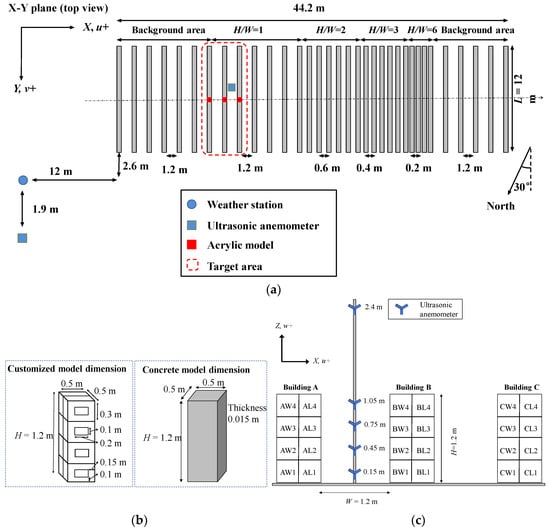 Descriptions of the experiment setup: (a) schematic view of the experiment field on the X–Y plane and instrument positions; (b) dimensions of the customized and concrete models; (c) schematic view of buildings and rooms in the street canyon.