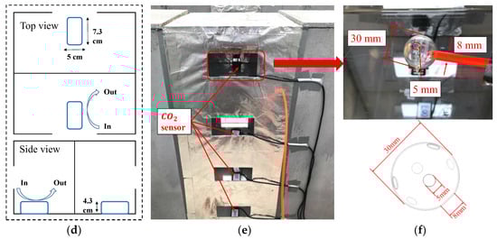 Setup for the wind masts, ultrasonic anemometer positions, tracer gas release, and concentration measurement: (a) 10 m mast at the side of the experiment field; (b) 2.4 m mast in the middle of the street canyon; (c) positions of the thermocouples; (d) positions of the CO2 sensors in each room; In: inlet of the sensor, Out: outlet of the sensor; (e) measurement setup; (f) customized plastic ball.