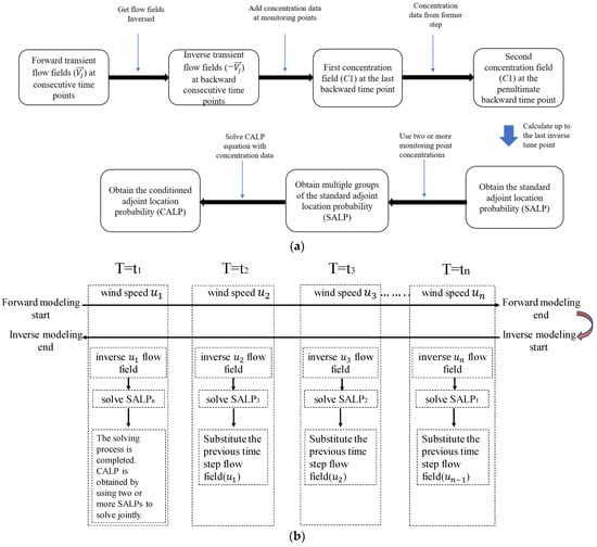 In the inverse simulation process, the velocity field at the last time step of the forward simulation process is initially reversed. The concentration is calculated at the location of the monitoring point to obtain the first concentration field in the reverse time step. Subsequently, all the concentration information in the computational domain is extracted and imported into the reverse velocity field under the penultimate time step in the forward process to continue the calculation. This is performed until the first time step is calculated in the forward process, and the obtained concentration field is the SALP in the dynamic flow field. The remaining processes in the reversal process under a dynamic airflow field are consistent with those under a steady-state airflow field, which can be observed in our previous paper []. A flowchart of the specific process used to identify the pollutant sources under dynamic airflow fields is shown in Figure 3a.