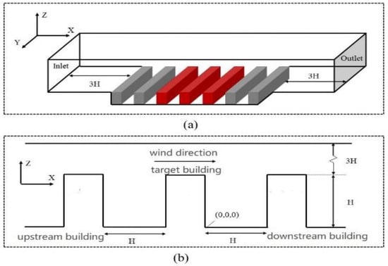 Model settings of the CFD simulation: (a) overall schematic of the model; (b) enlarged schematic of target buildings in the street canyon.