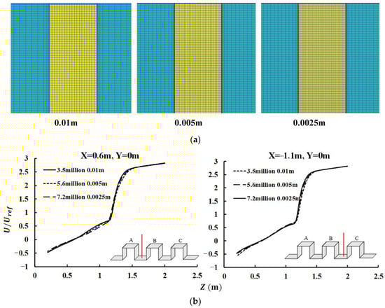 Sensitivity tests for the CFD simulations: (a) near wall grid sizing of the three systems; (b) sensitivity tests for the three mesh systems at lines X = −1.1 m, Y = 0 m, Z = 0–2 m; X = 0.6 m, Y = 0 m, Z = 0–2 m.