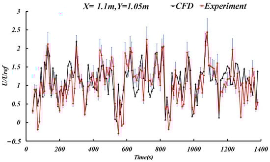 Comparisons of the dimensionless U velocity of the CFD simulation and experimental measurement (from 14:20:00 to 14:43:20 on 9 June 2019) in the street canyon.