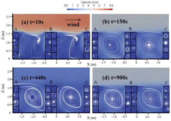 We selected four time points to underline the airflow field inside and above the street canyons, as shown in Figure 5b. The velocities at (14:16:15) and (14:23:25) were the highest and lowest values of the boundary velocity, respectively; the velocities at (14:16:15) and (14:31:05) were the starting and ending values of the boundary velocity, respectively; and the velocities at (14:18:35) were the average values of the boundary velocity.