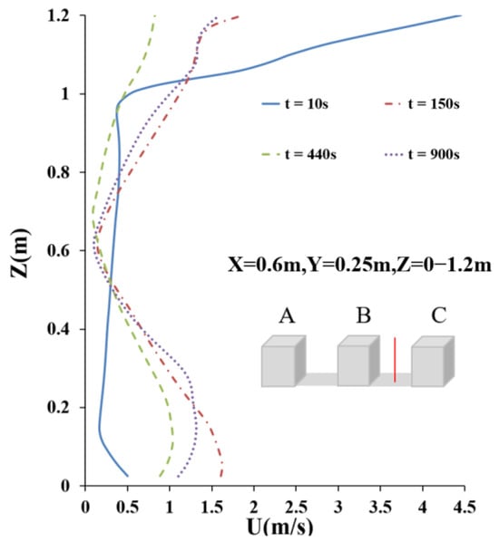 As shown in Figure 9, the wind speed was different at the vertical line () in the street canyon. Owing to the vortex movement and centrifugal effect, the wind speeds at the bottom and top of the street canyon were much higher than those at the middle height of the street canyon. From to , the four wind speeds exhibited a fluctuating trend with changes in the time-varying wind conditions.