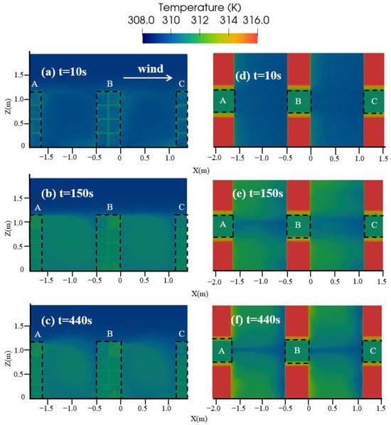 The effect of time-varying wind conditions on the temperature distribution in street canyon models was studied at three different time points (). The velocities at and were the highest and lowest values of the boundary velocity, respectively, and the velocity at was the average value of the boundary velocity. As shown in Figure 10, the leeward room temperature on top of the street canyon (room BL4) was higher than that of the windward room (room BW4), and the temperature on the leeward sidewall of the street canyon was slightly higher than that on the windward side. This may be attributed to the solar direction: the leeward side of the street canyon absorbed more solar energy than the windward side, as described in a scaled outdoor experiment []. The internal temperature distribution was analogous to that of the airflow vortex in a street canyon. When the low-temperature incident wind flowed over the street canyon, the incident wind and air in the street canyon underwent a heat exchange process, and the wind removed part of the heat in the street canyon, reducing the air temperature in the street canyon. Similar results were obtained by Li et al. [], where the air temperature of the street canyon was directly related to the airflow temperature, and a lower wind speed was conducive to heat dispersion in the street canyon. Some studies have also shown that the ambient wind speed can affect the temperature of street canyons, and a decrease in ambient wind speed can result in an increase in temperature [].