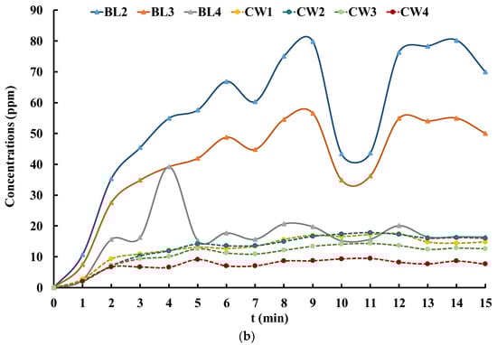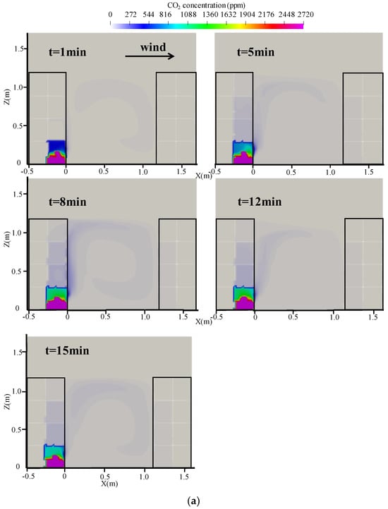 In this study, continuous periods (t = 1, 5, 8, 12, and 15 min) were selected to observe concentration changes under time-varying wind conditions. As shown in Figure 11a, at t = 1 min, the CO2 in room BL1 was released for 1 min, and the pollutants were primarily concentrated in the lower part of the room. At t = 5 min, the outdoor wind speed decreased, and the tracer gas entered the upper two rooms. Under the effect of dynamic wind, the tracer gas diffused from the opening of the source room to rooms BL2 and BL3; however, the concentration magnitude levels of these two rooms were much lower than those of the source room. At t = 8 min, the outdoor wind speed was the average wind speed during the entire process, which was slightly higher than that at t = 5 min. Here, the tracer gas concentration accumulated in the source room, and the concentration value was higher than that at t = 1 min. The tracer gas also spread across rooms; after entering BL2 and BL3 rooms successively, the tracer gas spread along the leeward side wall to the top of the street canyon. At t = 12 min, when the wind speed reached its maximum value, the air mass in the street canyons was compressed by the upper airflow, and the diffusion process of the tracer gas to the top of the street canyons was weakened. At t = 15 min, the re-entered tracer gas dispersed in rooms BL2 and BL3 was more evenly dispersed, owing to the dynamic wind effect.