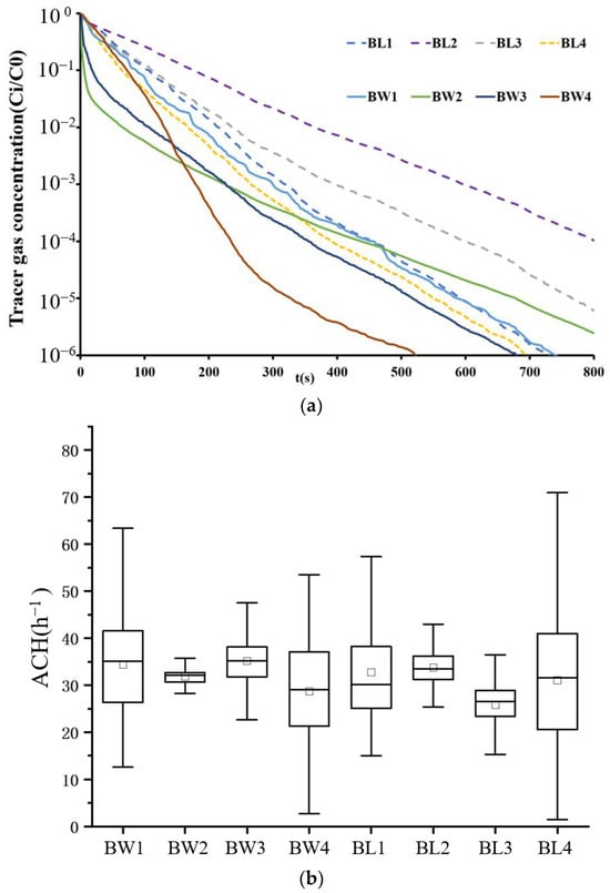 In this experiment, each room served as a source room several times. The source gas concentration was . The output values were averaged over one second at a sampling frequency of . The flow rate of the tracer gas was , and it was continuously delivered for approximately 30 min. For the wind speed, wind direction, air and wall temperatures, and concentrations in each room, all instruments were used concurrently. The gas-releasing tube was removed after each test was completed. Before the subsequent test was started, the CO2 concentration in the former source room had to reach background levels. Detailed information can be observed in our previous papers [,].