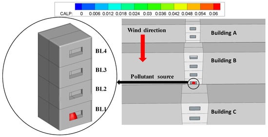 During the period from 15:12 to 15:19 p.m., monitoring rooms BL3, BL4, and AW3 of the street canyon building were alarmed, and the real-time concentration data monitored by the pollutant sensors are shown in Table 5. The pollutant concentrations in rooms BL3 and BL4 exceeded the limits approximately 1 and 4 min after the beginning of the experiment, respectively. The measured pollutant concentration data from these three rooms were used as inputs for inverse modeling. The forward velocity field was simulated based on the wind speed information obtained from the experiment during this period. Subsequently, the SALP probability fields of monitored rooms BL3 and BL4 could be obtained. The predicted pollutant source locations are shown in Figure 14.