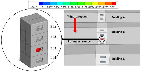 The figure shows that the predicted pollutant location was at the center of room BL2, and the value for the CALP is 0.32. The value of CALP for room BL2 is greater than the other rooms. For comparison with the experimental settings, the source room was room BL2. Furthermore, the highest concentration value occurred in room BL3, which could be up to 154.6 ppm, one order of magnitude beyond the concentration limit. This value was the maximum concentration detected in the monitored room throughout the experiment. This was sufficient to show that source room BL2 had a significant impact on the upper room.