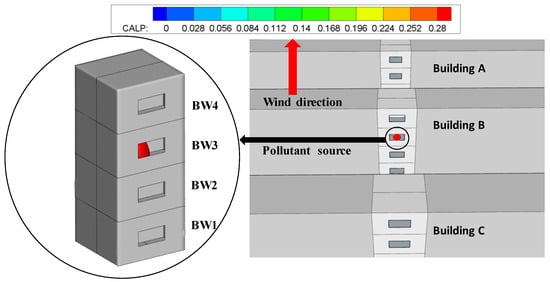 During the period from 12:28 to 12:32 p.m., monitoring rooms BW2 and BW1 of the street canyon building were alarmed, and the real-time concentration data monitored by the pollutant sensors are shown in Table 6. Only the two monitored rooms in Case 3 obtained concentration data that exceeded the limit values during the experimental period. The pollutant concentration in room BW2 detected the over-limit value 1 min after the start of the experiment and directly reached 31.4 ppm, up to 88 ppm. Concentrations above the limit in room BW1 were detected after 4 min. Using the concentration data from these two monitored rooms and applying inverse modeling, we predicted that the maximum probability of the source was located on the lower side of room BW3 and the value for the CALP is 0.28, as shown in Figure 15. The value of CALP for room BW3 is greater than the other rooms. The experiment revealed that the source room was set in room BW3 during the period, which indicated the successful application of source identification.
