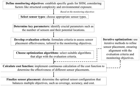 Within the steps involved, the pivotal points in OSP research are the evaluation criterion and the optimization algorithm. The evaluation criterion hinges on the specific monitoring objectives and must adeptly mirror the effectiveness of the sensor placement solution within those objectives. Typically, in the context of OSP, a continuous calculation of the cost function is imperative for ascertaining the optimal solution. Consequently, the structure and format of the evaluation criterion wield a substantial influence on the computational efficiency of the OSP, bearing substantial importance in this regard.