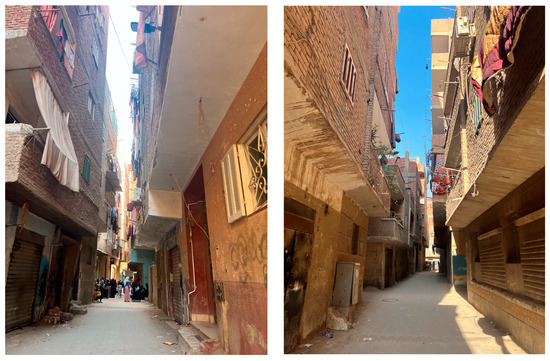 The narrow streets with a high density and high floor area ratio of the unplanned informal area, Marg, Greater Cairo. Taken by the authors (2022).