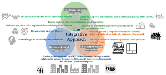 As the socioeconomic approach elaborates, the government and the private sector act as enablers [48]. Residents of the informal contexts are to be perceived as experts on their self-designed settlements. Consequently, exploring more analytical procedures to integrate the informal economy with its sociospatial dimensions is demanded to guide tenure formalization systems. The morphological perspective underlies the incremental adaptation processes in the growth of various informal forms allowed by a mix of formal and informal conditions [58]. Thus, urban informality is not only sociopolitically challenging but also spatially problematic. Therefore, the sociophysical perspective acknowledges an interdisciplinary framework that focuses on assessing and re-conceptualization space as context. It calls for multidimensional analytic procedures to the built environment of informal context as the product formed through a triadic relationship of three interrelated types of spaces: the conceived (imagined), the perceived (measured), and the lived (experienced) [11].