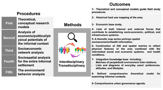 Few pieces of literature have called for a holistic approach to dealing with informal settlements that go beyond one single approach and combine the socioeconomic, physical, morphological, and environmental constructs [8,9,10]. As a continuity of the holistic vision to understand and examine the slums with an interdisciplinary approach, this paper presents a novel operational and procedural inter/transdisciplinary framework in Egypt.