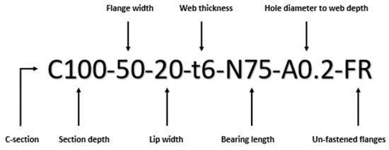 The non-linear FE models for unfastened and fastened CHS channels were developed using ABAQUS [29]. The centerline dimensions of the CHS channel section were considered. The model was developed using cross-sectional dimensions. As shown in Figure 3, four parts were defined to simulate the testing configuration, namely the channel section, the support bearing plates placed at both ends of the channel section, and the supporting block fastened at the back of the channel section using connectors. The section web crippling associated capacity was obtained by picking up the reaction forces through the support-bearing plates. Figure 4 summarizes the CHS channel symbol definitions, where the labelling of the specimen is shown in Figure 5. The detailed modelling technique is described below.