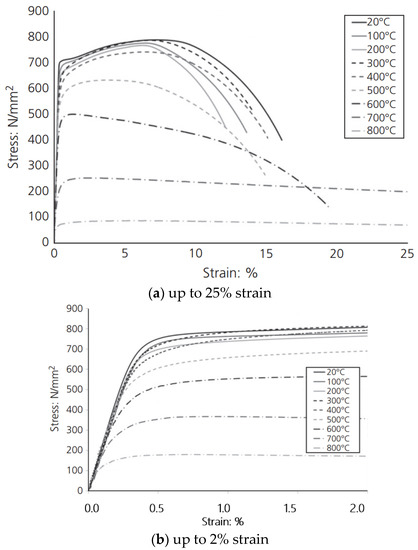 The stress-strain curve for steel grade S690QL at ambient and elevated temperatures was taken from the study of Winful et al. [30]. It was then transformed to actual stress-plastic strain using Equations (3) and (4) [29]. The stress-strain material curves are shown in Figure 6 and the material properties of S690QL steel grade are summarised in Table 2.
