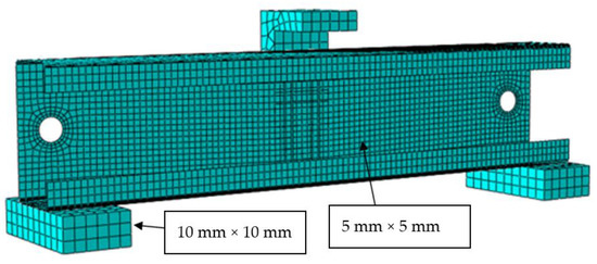 For a modelling element type consistent with previous researchers [15,16,17,18,19,20,21,22,31,32,33,34], a quadrilateral shell SR4 element type with four nodes was used to model channels in ABAQUS, which is applicable for general shell purpose application and can capture finite membrane shell strains that are suitable for structural analysis. A mesh size (5 mm × 5 mm) was adopted for the channels, where a mesh convergence setting is ensured in the analysis acceptance criteria. The mesh size of 10 mm × 10 mm was adequate for the bearing plates. For validating the FE model, smaller mesh sizes were adopted at the inside bend corners and around the web openings. The mesh sizes for different parts are shown in Figure 7 for FE models.