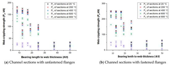 The effect of the r/t ratio on the web crippling strength of CHS channels was investigated. As demonstrated in Figure 9, the negative influence of the r/t ratio on the web crippling strength can be observed. At ambient temperature, the average web crippling strength of CHS fastened and unfastened channels fell by 85.77% and 82.45%, respectively, from 0.5 to 1.5.